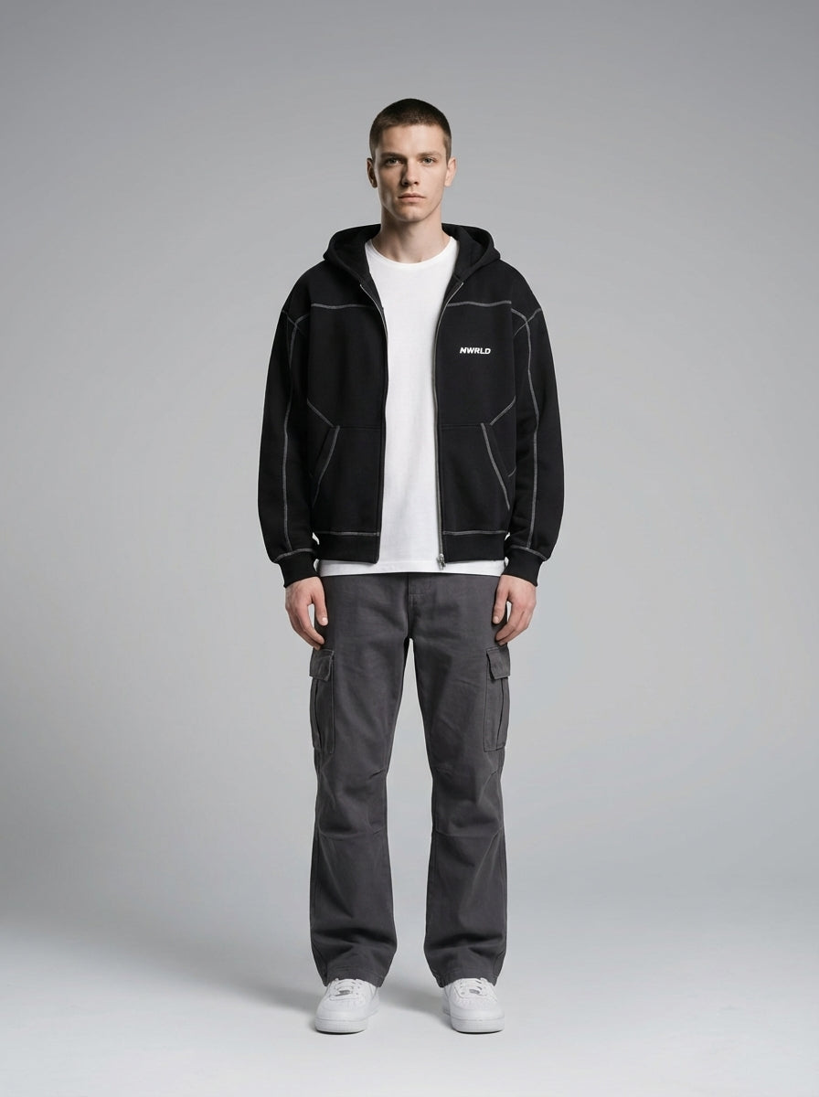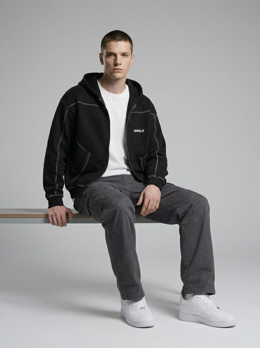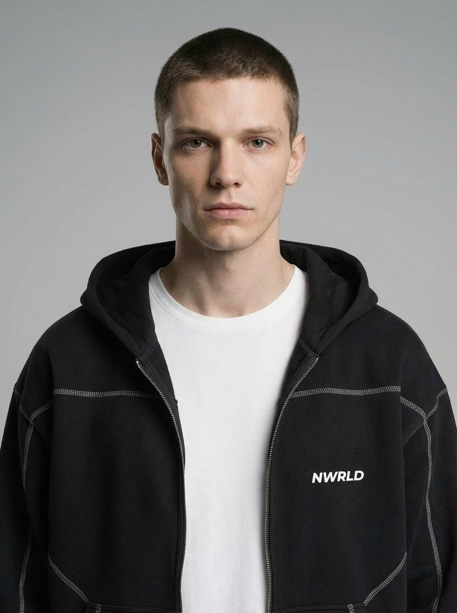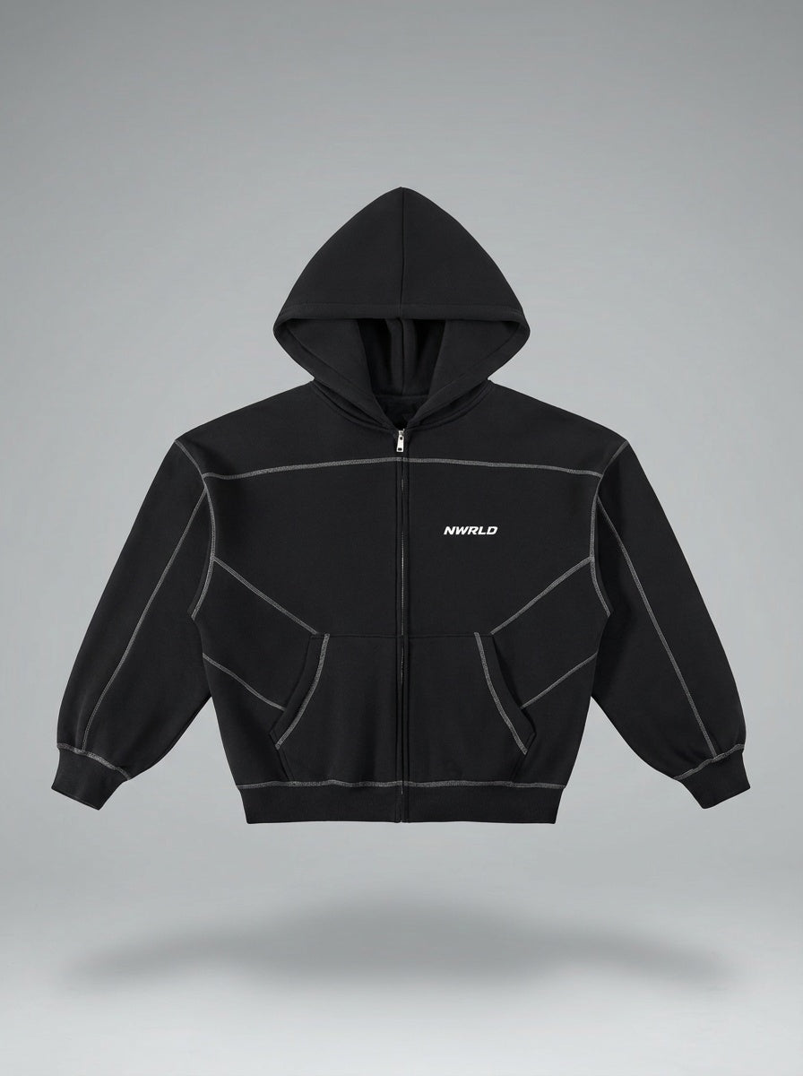 NWRLD 003 | Contrast-Stitched Boxy Fleece Zip Hoodie