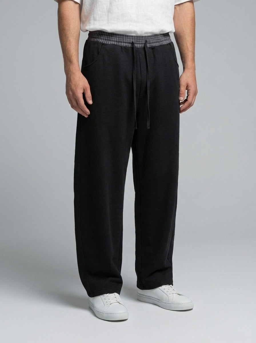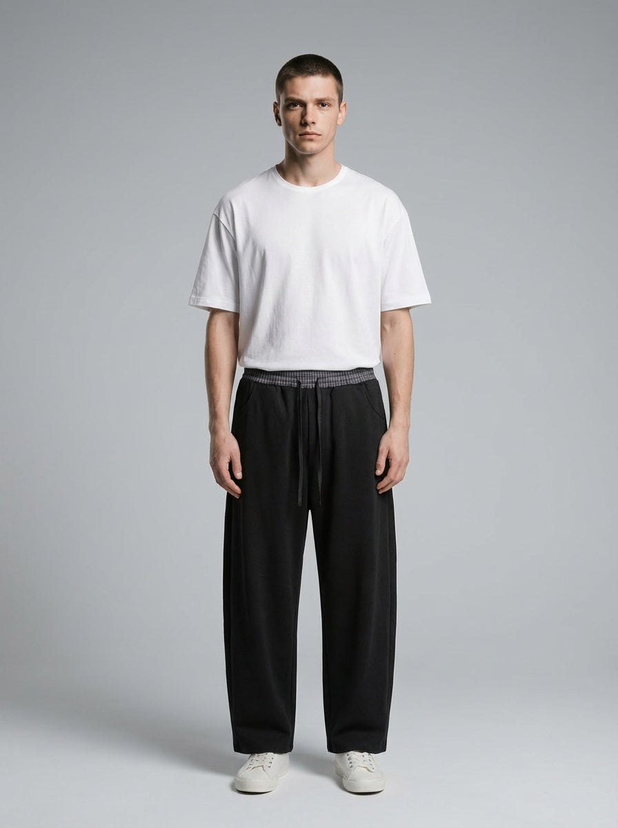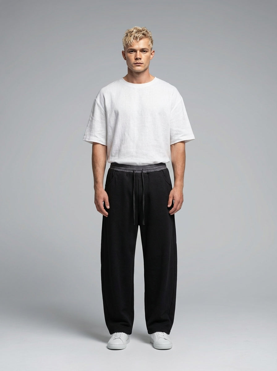 NWRLD 003 / Plaid Waistband Barrel Sweatpants merge utilitarian design with considered detailing. The distinctive plaid waistband introduces subtle visual interest whilst maintaining the clean aesthetic of the silhouette. Barrel-leg proportions offer a contemporary alternative to traditional tapered cuts, providing comfortable ankle definition without restrictive tapering. Premium sweatpant construction ensures durability through repeated wear and washing, with fabric that resists pilling and maintains its shape. The refined colour blocking and proportional balance elevate these beyond basic loungewear, positioning them as a versatile layering piece suitable for both relaxed and semi-casual contexts.
