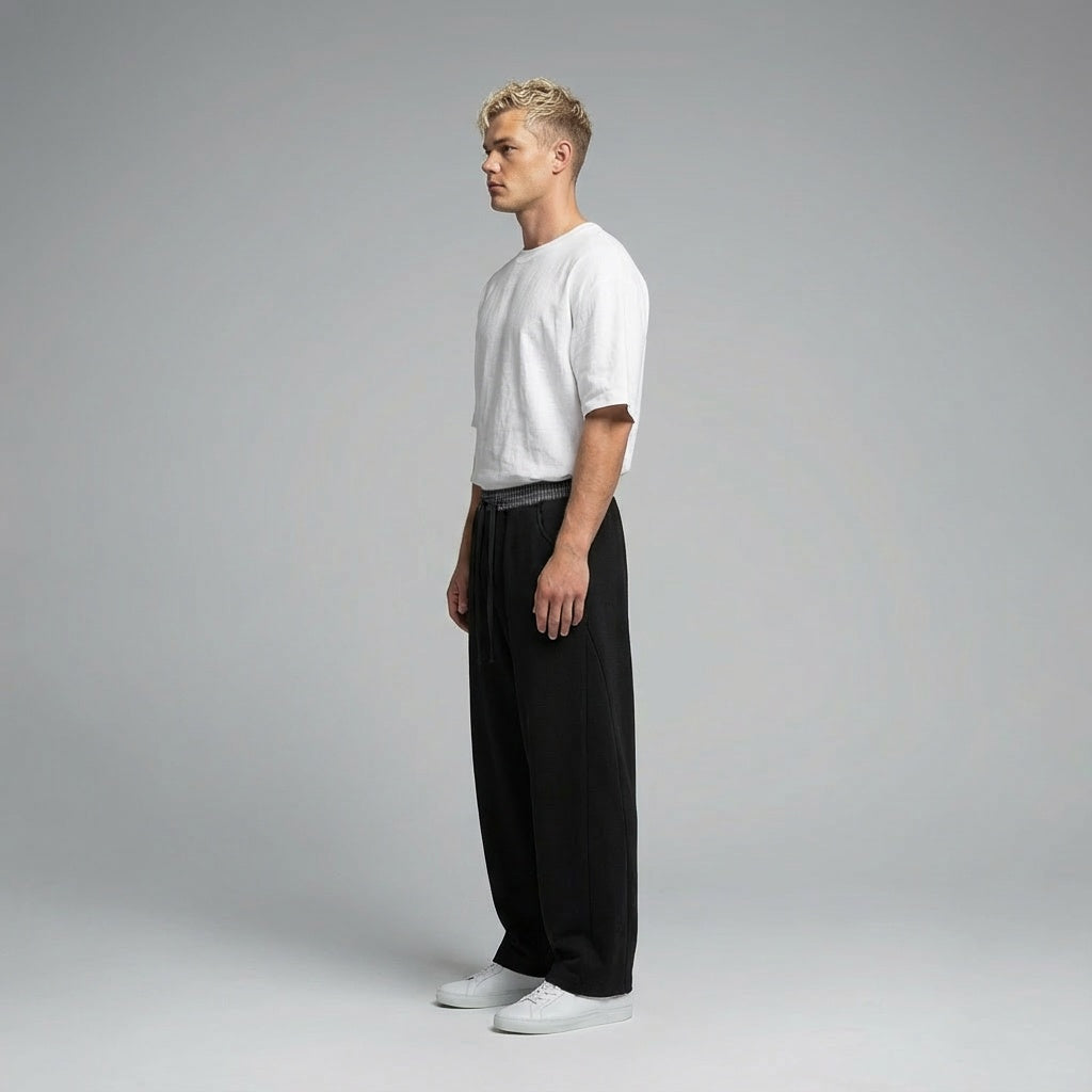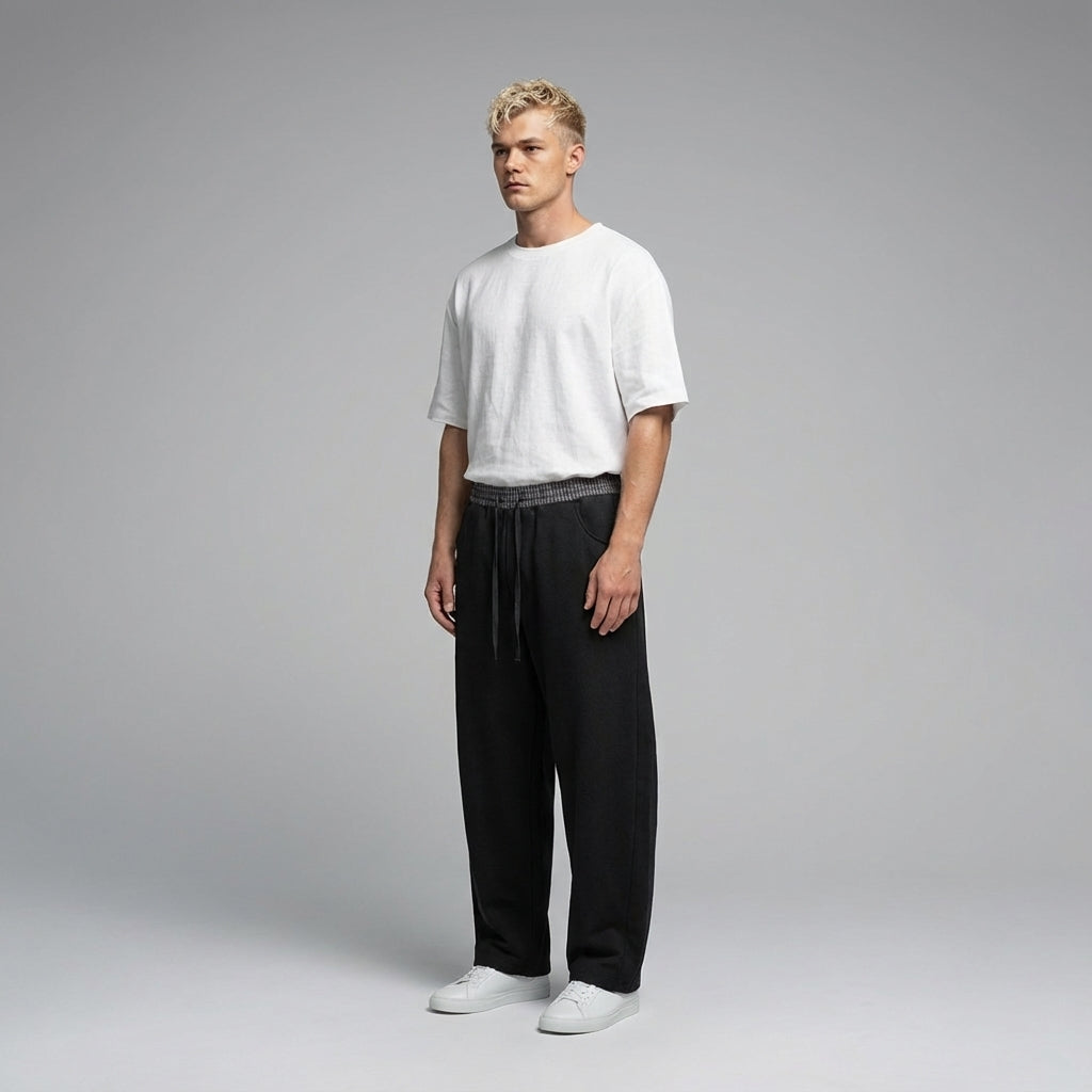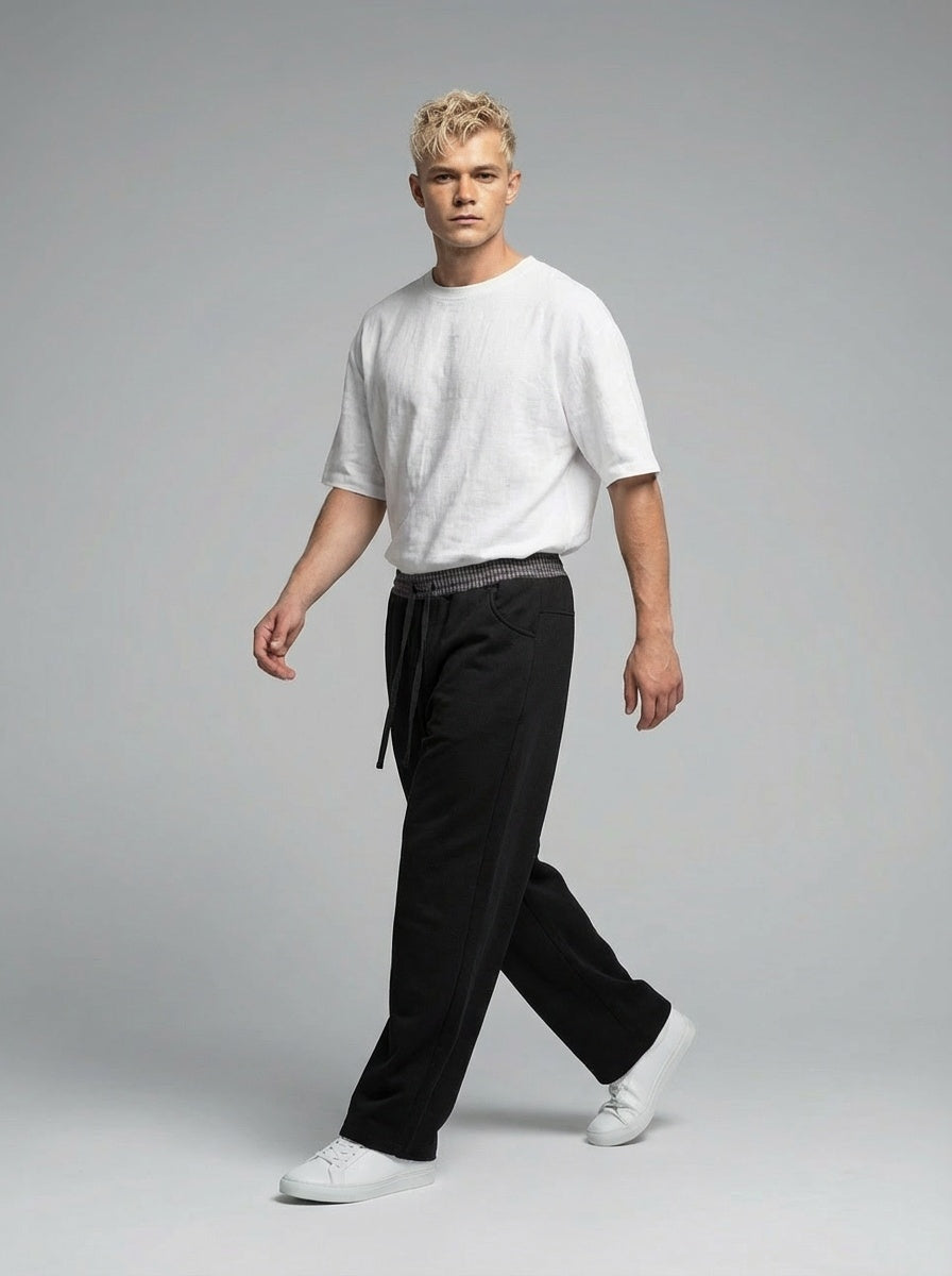 NWRLD 003 / Plaid Waistband Barrel Sweatpants merge utilitarian design with considered detailing. The distinctive plaid waistband introduces subtle visual interest whilst maintaining the clean aesthetic of the silhouette. Barrel-leg proportions offer a contemporary alternative to traditional tapered cuts, providing comfortable ankle definition without restrictive tapering. Premium sweatpant construction ensures durability through repeated wear and washing, with fabric that resists pilling and maintains its shape. The refined colour blocking and proportional balance elevate these beyond basic loungewear, positioning them as a versatile layering piece suitable for both relaxed and semi-casual contexts.