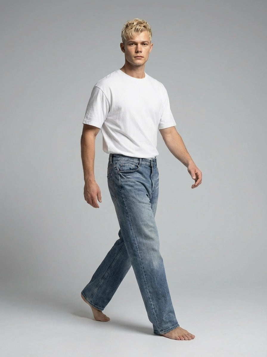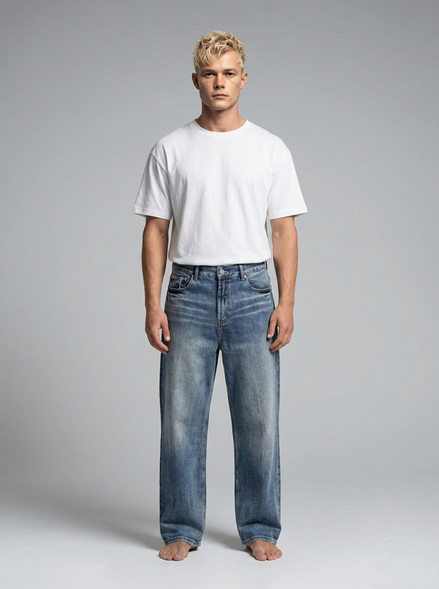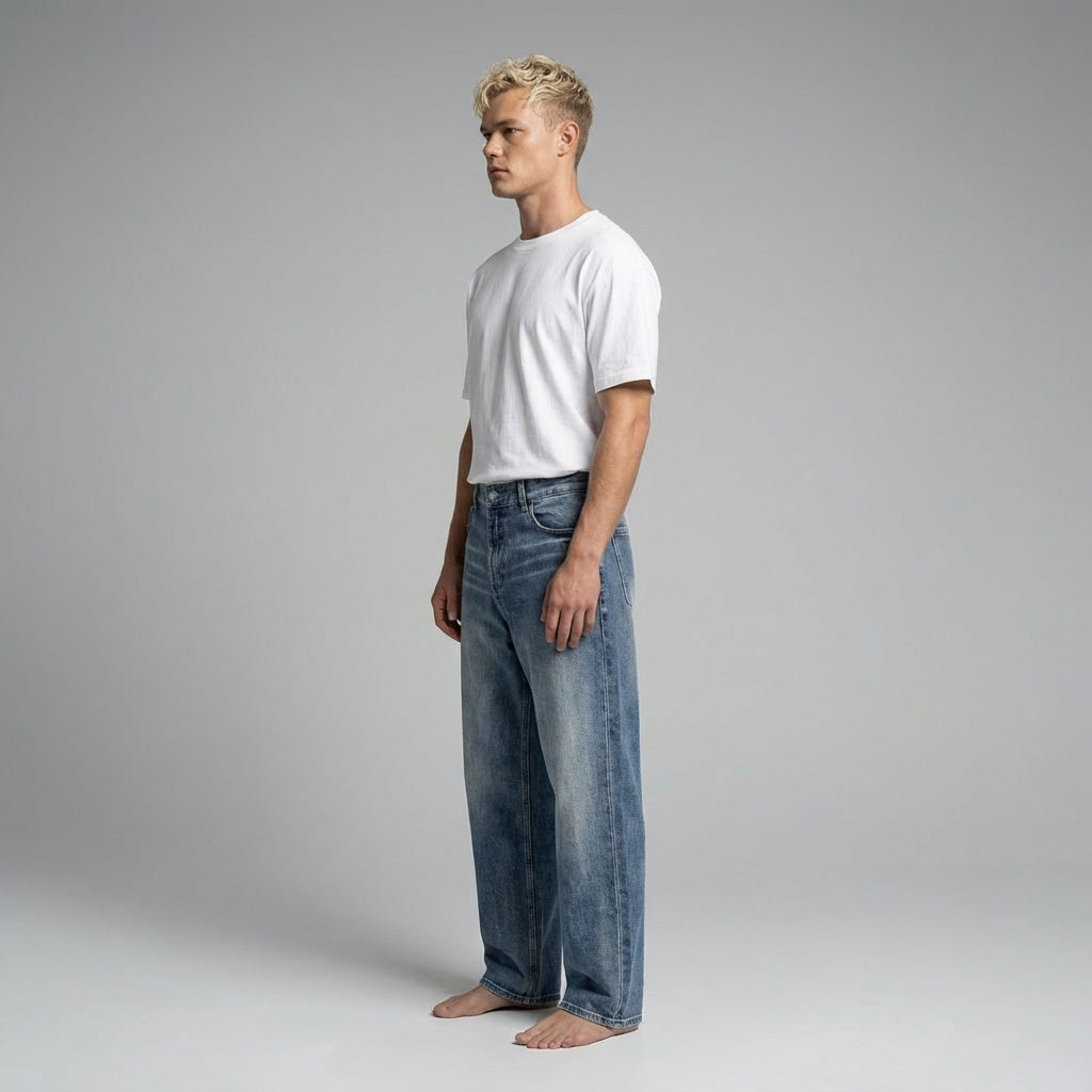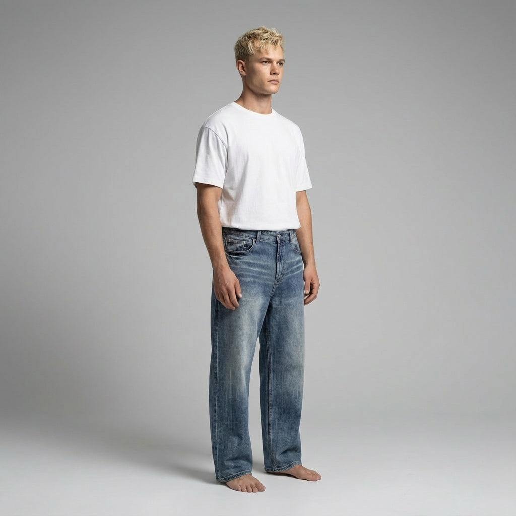 NWRLD 003 / Sun Fade Heavyweight Denim Jeans represent a masterclass in durable workwear construction. Crafted from premium heavyweight denim, these jeans feature a distinctive sun-faded finish that develops authentic character with wear. The robust fabric weight ensures longevity and structure, resisting premature wear while maintaining its shape through repeated washing. The sun fade aesthetic offers a refined vintage appeal without sacrificing modern comfort. Ideal for those seeking investment-quality denim that balances heritage craftsmanship with contemporary design sensibilities.